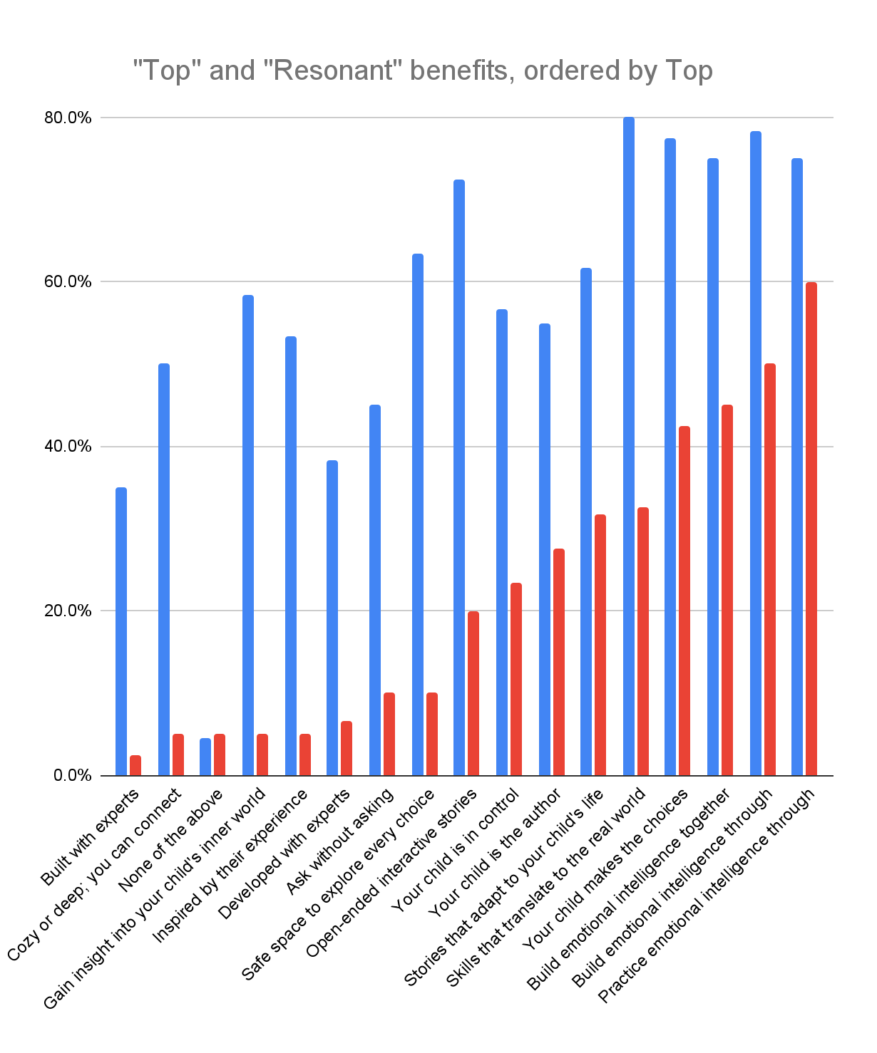 It was clear that building emotional intelligence through play (i.e., through interactive stories) was a top benefit, followed by child agency and real-world applications. In a follow-up analysis, partnership with experts was important for people with a higher willingness to pay.
