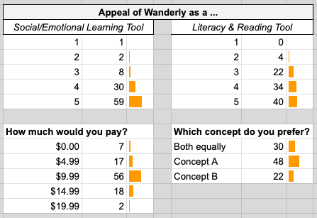 I first created text-only descriptions of Wanderly as a social-emotional learning tool and as a literacy tool, as if I had already built the long-term version of each. I cited expert review, envisioned additional content, and outlined the features I considered necessary to bring those concepts to life. I edited so that each concept was of equal quality and presentation. Then I constructed a survey that had this rough flow: